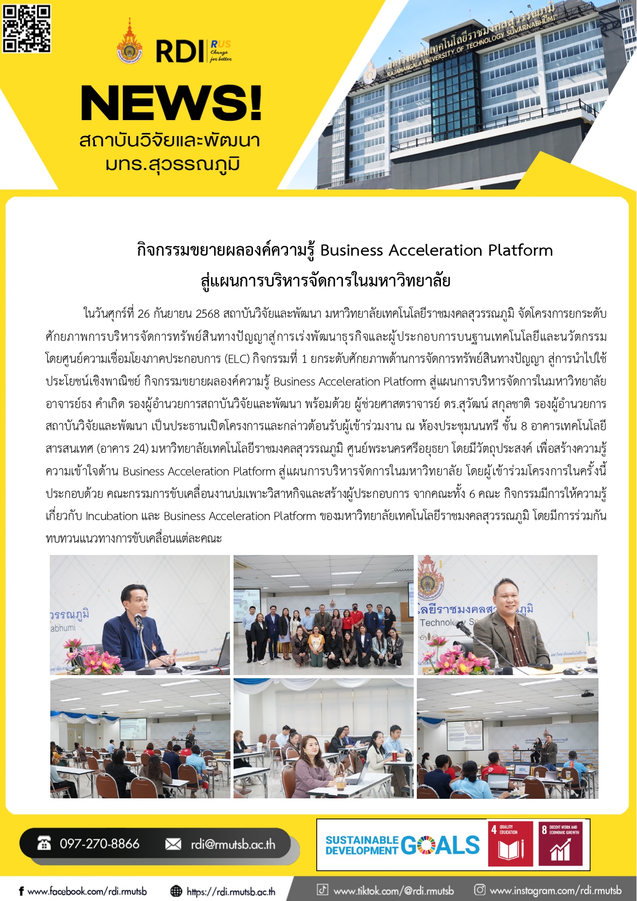 ในวันศุกร์ที่ 26 กันยายน 2568 สถาบันวิจัยและพัฒนา มหาวิทยาลัยเทคโนโลยีราชมงคลสุวรรณภูมิ จัดโครงการยกระดับศักยภาพการบริหารจัดการทรัพย์สินทางปัญญาสู่การเร่งพัฒนาธุรกิจและผู้ประกอบการบนฐานเทคโนโลยีและนวัตกรรมโดยศูนย์ความเชื่อมโยงภาคประกอบการ (ELC) กิจกรรมที่ 1 ยกระดับศักยภาพด้านการจัดการทรัพย์สินทางปัญญา สู่การนำไปใช้ประโยชน์เชิงพาณิชย์ กิจกรรมขยายผลองค์ความรู้ Business Acceleration Platform สู่แผนการบริหารจัดการในมหาวิทยาลัย อาจารย์ธง คำเกิด รองผู้อำนวยการสถาบันวิจัยและพัฒนา พร้อมด้วย ผู้ช่วยศาสตราจารย์ ดร.สุวัฒน์ สกุลชาติ รองผู้อำนวยการสถาบันวิจัยและพัฒนา เป็นประธานเปิดโครงการและกล่าวต้อนรับผู้เข้าร่วมงาน ณ ห้องประชุมนนทรี ชั้น 8 อาคารเทคโนโลยีสารสนเทศ (อาคาร 24) มหาวิทยาลัยเทคโนโลยีราชมงคลสุวรรณภูมิ ศูนย์พระนครศรีอยุธยา โดยมีวัตถุประสงค์ เพื่อสร้างความรู้ความเข้าใจด้าน Business Acceleration Platform สู่แผนการบริหารจัดการในมหาวิทยาลัย โดยผู้เข้าร่วมโครงการในครั้งนี้ประกอบด้วย คณะกรรมการขับเคลื่อนงานบ่มเพาะวิสาหกิจและสร้างผู้ประกอบการ จากคณะทั้ง 6 คณะ กิจกรรมมีการให้ความรู้เกี่ยวกับ Incubation และ Business Acceleration Platform ของมหาวิทยาลัยเทคโนโลยีราชมงคลสุวรรณภูมิ โดยมีการร่วมกันทบทวนแนวทางการขับเคลื่อนแต่ละคณะ