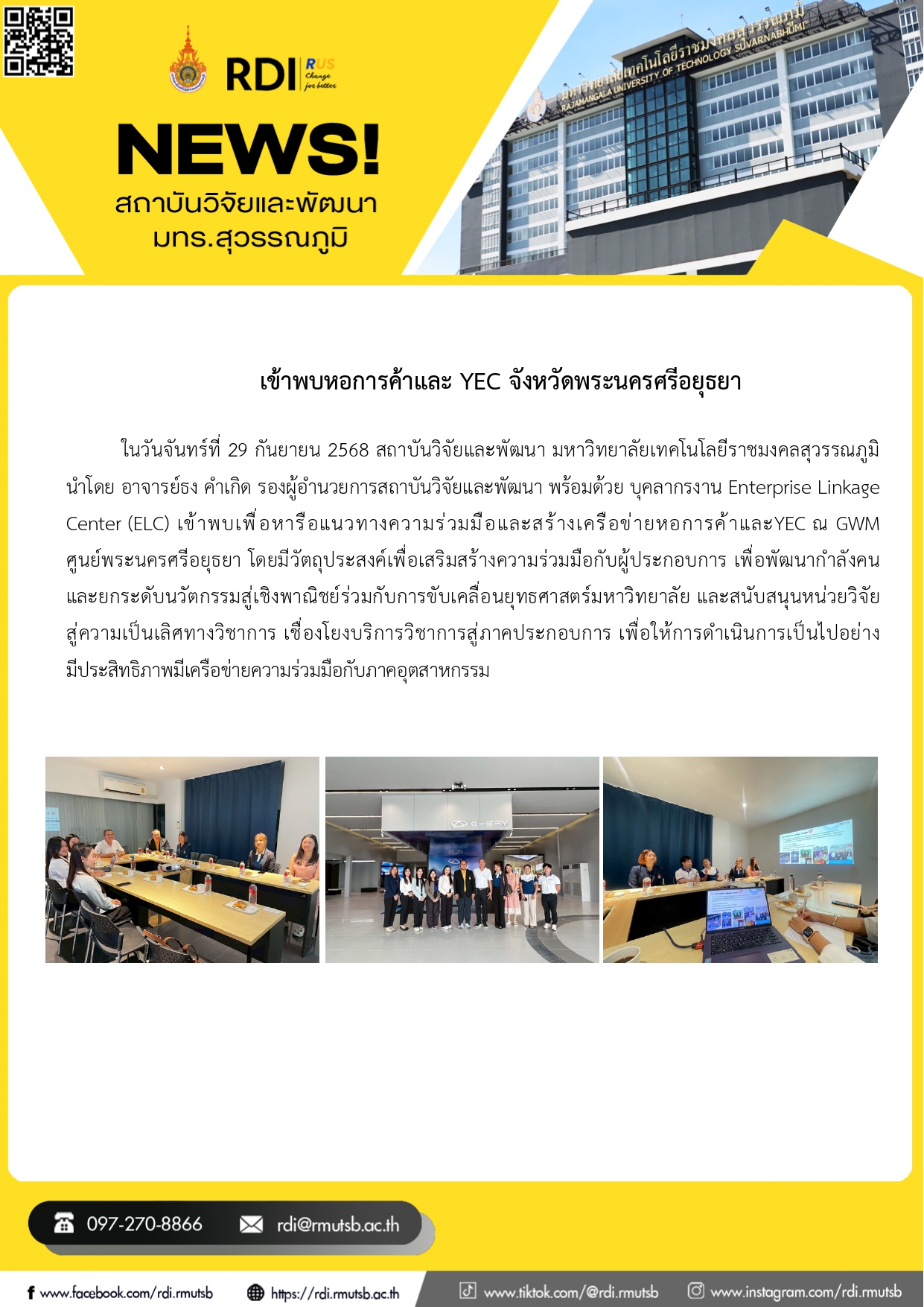 ในวันจันทร์ที่ 29 กันยายน 2568 สถาบันวิจัยและพัฒนา มหาวิทยาลัยเทคโนโลยีราชมงคลสุวรรณภูมิ นำโดย อาจารย์ธง คำเกิด รองผู้อำนวยการสถาบันวิจัยและพัฒนา พร้อมด้วย บุคลากรงาน Enterprise Linkage Center (ELC) เข้าพบเพื่อหารือแนวทางความร่วมมือและสร้างเครือข่ายหอการค้าและYEC ณ GWM ศูนย์พระนครศรีอยุธยา โดยมีวัตถุประสงค์เพื่อเสริมสร้างความร่วมมือกับผู้ประกอบการ เพื่อพัฒนากำลังคน และยกระดับนวัตกรรมสู่เชิงพาณิชย์ร่วมกับการขับเคลื่อนยุทธศาสตร์มหาวิทยาลัย และสนับสนุนหน่วยวิจัย สู่ความเป็นเลิศทางวิชาการ เชื่องโยงบริการวิชาการสู่ภาคประกอบการ เพื่อให้การดำเนินการเป็นไปอย่างมีประสิทธิภาพมีเครือข่ายความร่วมมือกับภาคอุตสาหกรรม