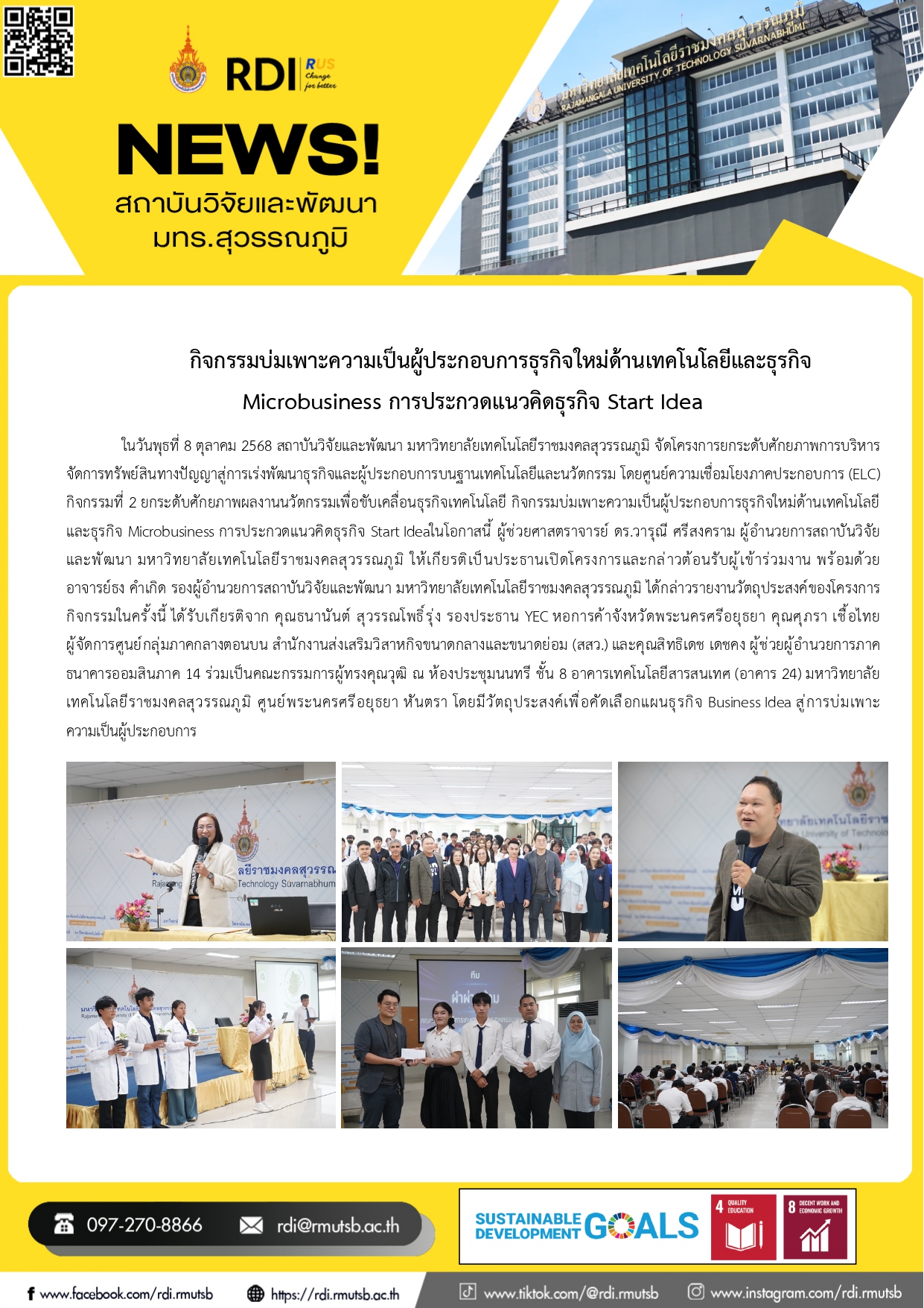 ในวันพุธที่ 8 ตุลาคม 2568 สถาบันวิจัยและพัฒนา มหาวิทยาลัยเทคโนโลยีราชมงคลสุวรรณภูมิ จัดโครงการยกระดับศักยภาพการบริหารจัดการทรัพย์สินทางปัญญาสู่การเร่งพัฒนาธุรกิจและผู้ประกอบการบนฐานเทคโนโลยีและนวัตกรรม โดยศูนย์ความเชื่อมโยงภาคประกอบการ (ELC) กิจกรรมที่ 2 ยกระดับศักยภาพผลงานนวัตกรรมเพื่อขับเคลื่อนธุรกิจเทคโนโลยี กิจกรรมบ่มเพาะความเป็นผู้ประกอบการธุรกิจใหม่ด้านเทคโนโลยีและธุรกิจ Microbusiness การประกวดแนวคิดธุรกิจ Start Ideaในโอกาสนี้ ผู้ช่วยศาสตราจารย์ ดร.วารุณี ศรีสงคราม ผู้อำนวยการสถาบันวิจัยและพัฒนา มหาวิทยาลัยเทคโนโลยีราชมงคลสุวรรณภูมิ ให้เกียรติเป็นประธานเปิดโครงการและกล่าวต้อนรับผู้เข้าร่วมงาน พร้อมด้วย อาจารย์ธง คำเกิด รองผู้อำนวยการสถาบันวิจัยและพัฒนา มหาวิทยาลัยเทคโนโลยีราชมงคลสุวรรณภูมิ ได้กล่าวรายงานวัตถุประสงค์ของโครงการ กิจกรรมในครั้งนี้ ได้รับเกียรติจาก คุณธนานันต์ สุวรรณโพธิ์รุ่ง รองประธาน YEC หอการค้าจังหวัดพระนครศรีอยุธยา คุณศุภรา เชื้อไทย ผู้จัดการศูนย์กลุ่มภาคกลางตอนบน สำนักงานส่งเสริมวิสาหกิจขนาดกลางและขนาดย่อม (สสว.) และคุณสิทธิเดช เดชคง ผู้ช่วยผู้อำนวยการภาคธนาคารออมสินภาค 14 ร่วมเป็นคณะกรรมการผู้ทรงคุณวุฒิ ณ ห้องประชุมนนทรี ชั้น 8 อาคารเทคโนโลยีสารสนเทศ (อาคาร 24) มหาวิทยาลัยเทคโนโลยีราชมงคลสุวรรณภูมิ ศูนย์พระนครศรีอยุธยา หันตรา โดยมีวัตถุประสงค์เพื่อคัดเลือกแผนธุรกิจ Business Idea สู่การบ่มเพาะความเป็นผู้ประกอบการ