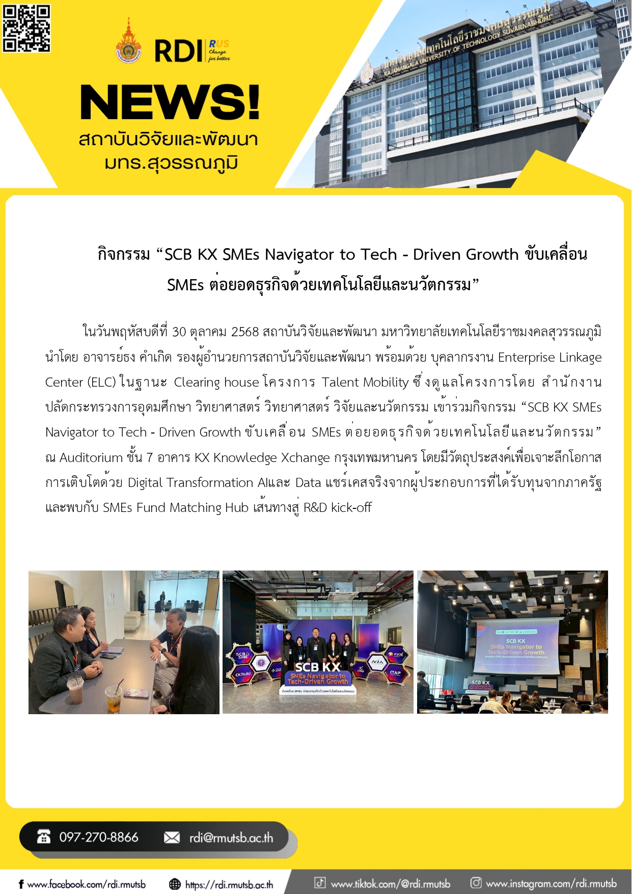ในวันพฤหัสบดีที่ 30 ตุลาคม 2568 สถาบันวิจัยและพัฒนา มหาวิทยาลัยเทคโนโลยีราชมงคลสุวรรณภูมิ นำโดย อาจารย์ธง คำเกิด รองผู้อำนวยการสถาบันวิจัยและพัฒนา พร้อมด้วย บุคลากรงาน Enterprise Linkage Center (ELC) ในฐานะ Clearing house โครงการ Talent Mobility ซึ่งดูแลโครงการโดย สำนักงานปลัดกระทรวงการอุดมศึกษา วิทยาศาสตร์ วิทยาศาสตร์ วิจัยและนวัตกรรม เข้าร่วมกิจกรรม “SCB KX SMEs Navigator to Tech - Driven Growth ขับเคลื่อน SMEs ต่อยอดธุรกิจด้วยเทคโนโลยีและนวัตกรรม” ณ Auditorium ชั้น 7 อาคาร KX Knowledge Xchange กรุงเทพมหานคร โดยมีวัตถุประสงค์เพื่อเจาะลึกโอกาสการเติบโตด้วย Digital Transformation AIและ Data แชร์เคสจริงจากผู้ประกอบการที่ได้รับทุนจากภาครัฐและพบกับ SMEs Fund Matching Hub เส้นทางสู่ R&D kick-off